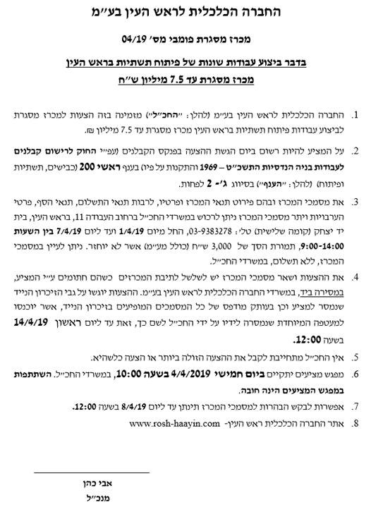 ביצוע עבודות שונות של פיתוח תשתיות בראש העין מכרז מסגרת עד 7.5 מיליון ש"ח